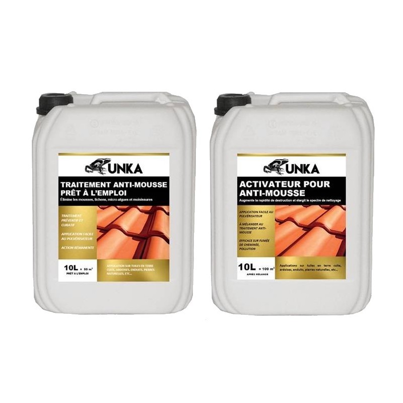 Traitement anti-mousse préventif et curatif, prêt à l’emploi, combiné à l'activateur pour réduire le temps d’action, efficace sur mousses, lichens, micro-algues, moisissures, pollutions atmosphériques, fumées de cheminée, traces noires... Il assure une protection durable de la surface traitée de part son action rémanente et respecte le support et la couleur. Il ne contient ni acide, ni solvant.